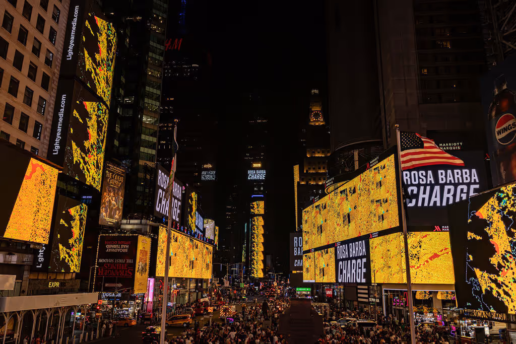Inspiration for the work began with the artist’s immersive research in a space observatory in Nançay, central France, where scientists use radio waves to build a picture of the universe. As part of her broader practice, Barba’s work reflects on human impact on the environment, drawing inspiration from natural elements. For Barba, cinema “allows time and space to vibrate, collapse, overlap, and extend.” In a bustling place like Times Square, moments to pause and appreciate the natural beauty of the world are rare. Charge offers a brief—but crucial—reprieve from the urban chaos.
