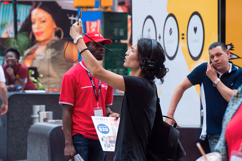 Turn your walk through Times Square into a journey through a song. Artists Mendi + Keith Obadike have stretched fragments of music, poetry, stories, and myths across the pedestrian plazas and surrounding blocks in all four cardinal directions, for visitors to discover whether they’re exploring the neighborhood or simply on their way to work. The result is Compass Song, an app-based public sound artwork inspired by Times Square’s rich history as the Crossroads of the World. Compass Song was commissioned by and created in residence with Times Square Arts.