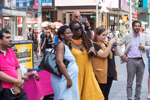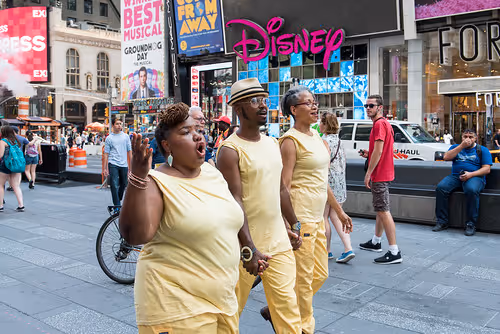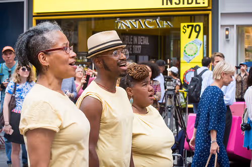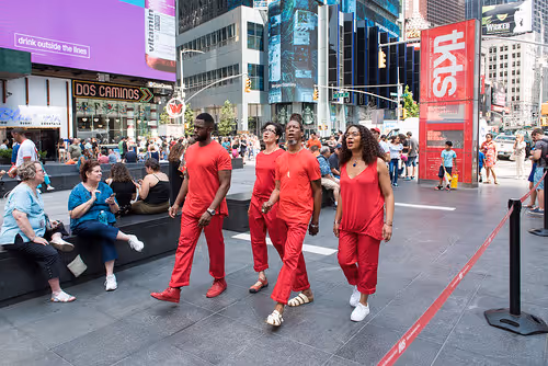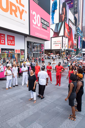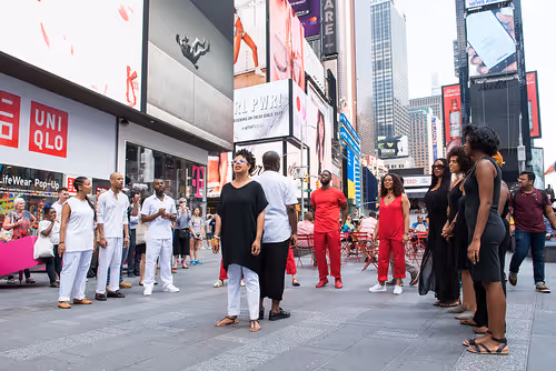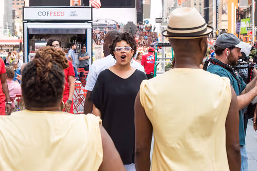 A special kick-off performance exemplifying the Compass Song experience will take place on Wednesday, July 12th on the Broadway Pedestrian Plaza between 45th and 46th Street. Sixteen performers will vocally recreate the city’s sounds as they hear them and then begin singing the freedom song Walk With Me as they divide into four ambulatory groups, each group walking off in one of the cardinal directions. The audience is encouraged to follow whichever group they choose, finding their own individual viewing and listening experience across the landscape of Times Square. Like the app itself, it is an invitation to meditate on the process of finding yourself at a crossroads and choosing your path.