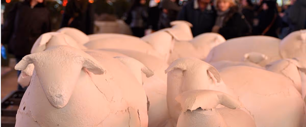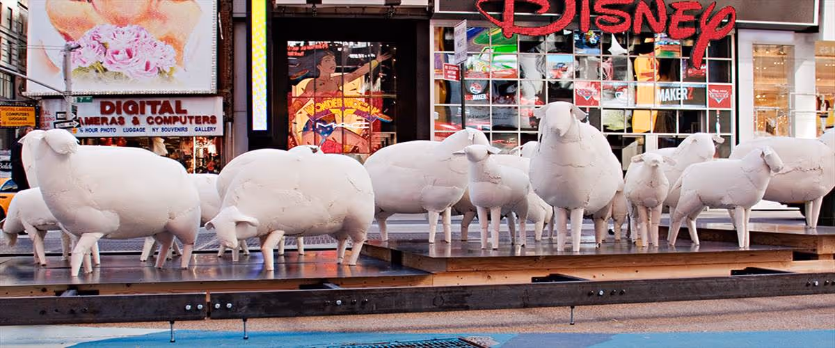 The Times Square Alliance, in partnership with the West Harlem Art Fund, Inc. is pleased to present Kyu Seok Oh’s installation, Counting Sheep. Counting Sheep was on display in Times Square from March 1 – 7, 2011 on the northern end of Broadway Plaza between 45th and 46th Streets. Spanning 36 feet long and 12 feet wide, the installation was comprised of 24 uniquely made paper sheep sculptures on 6” to 16” high platforms. All of the sheep were hand-made by the artist himself in a labor-intensive process involving natural and traditional materials. “I like to think that both paper and wood, though processed to be used as structural materials, are in fact very much alive as part of nature,” the artist explains. “A group of white paper sheep suddenly emerging from a corner of Times Square will create a contrast to the intimidating, chaotic atmosphere associated with that sleepless corner of the world. Soft, white, and standing together these sheep will invite the neon covered surrounding buildings and large excited crowds to relax, count sheep, and doze off a little.”
