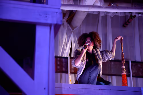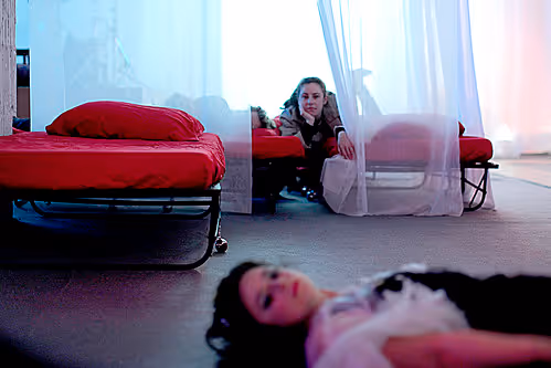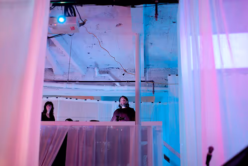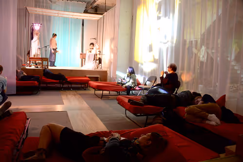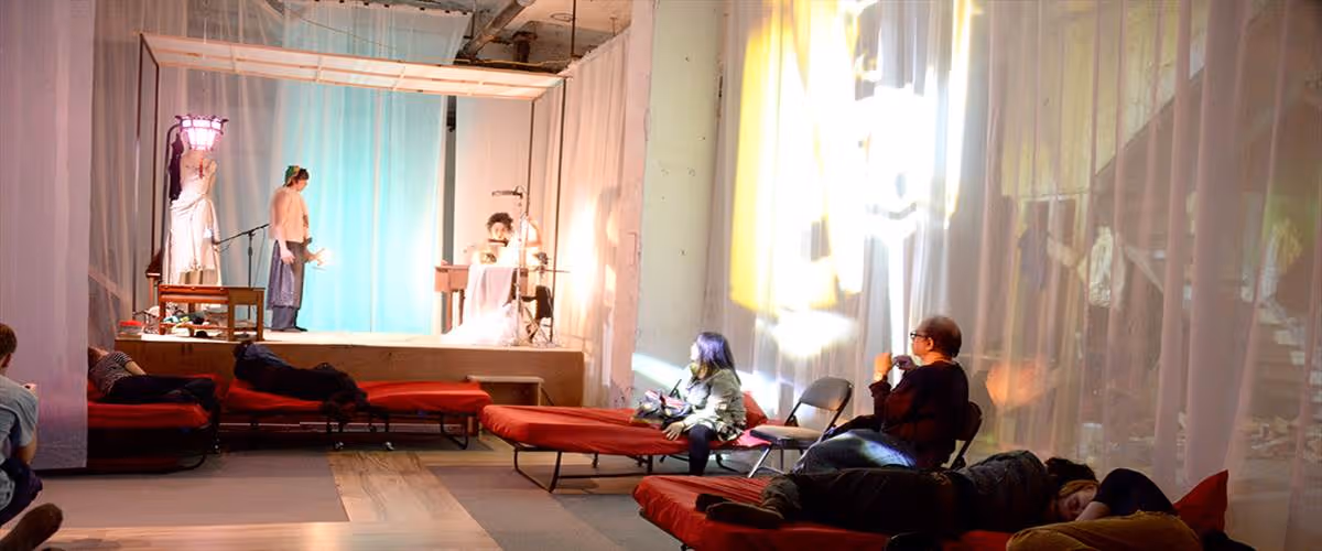 The set, video, sound, and lighting design of Dream of the Red Chamber transformed the vast basement space of the iconic Brill Building into an environment that advocated and facilitated sleep. The audience could choose to experience the work while lying and/or sleeping in one of the many beds that filled the basement or to sit and watch from a more traditional chair, as the performers traveled through the space and the story unfolded.