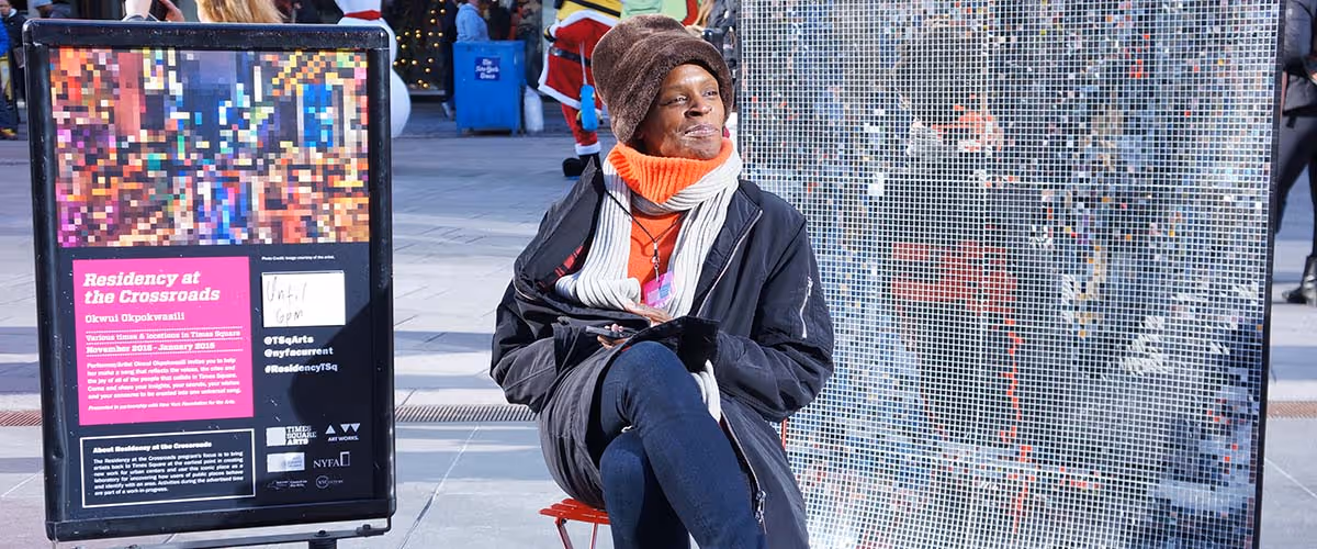 During the Fall of 2015, Okwui Okpokwasili worked with Peter Born to engage with visitors in Times Square, capture their voices and create a song at the Crossroads of the World, questioning whether the neighborhood can serve as a global commons for creative dialogue and exchange. By asking people to tell her what they’ve always wanted to share with the world, Okpokwasili has explored whether a common cry, idea or desire emerges from their comments. Her residency ran from mid-September 2015 to January 2016.