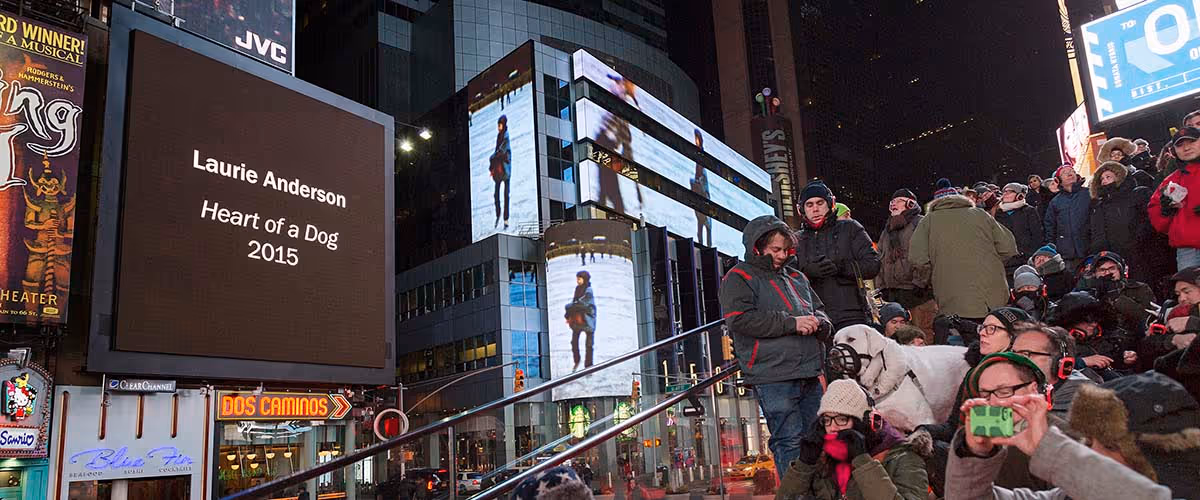 Laurie Anderson adapted her feature film, Heart of a Dog, which has been short-listed for an Academy Award, for Times Square. This unique edition of the film was shown on Times Square’s electronic billboards from 11:57 pm to midnight from January 1-31, 2016. This project was a part of Midnight Moment, a monthly presentation by The Times Square Advertising Coalition (TSAC) and Times Square Arts.