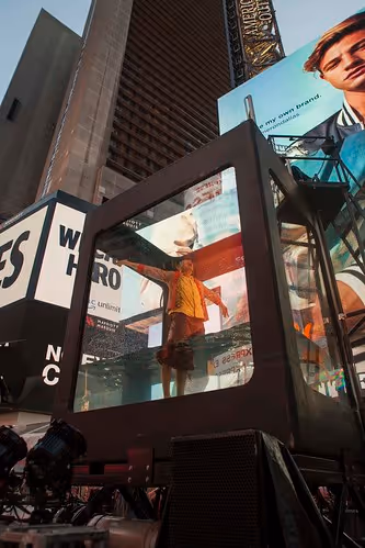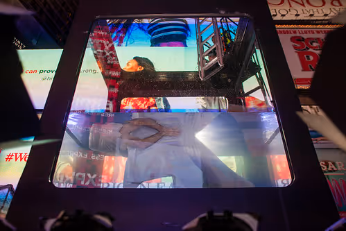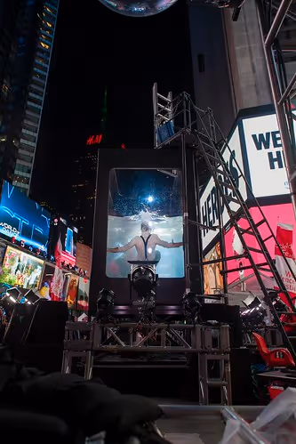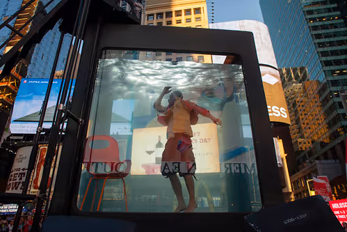 Sited in public space, Holoscenes features a totemic aquarium-like sculpture filled and drained by a custom hydraulic system, capable of flooding the aquarium with twelve tons of water in as little as 45 seconds.