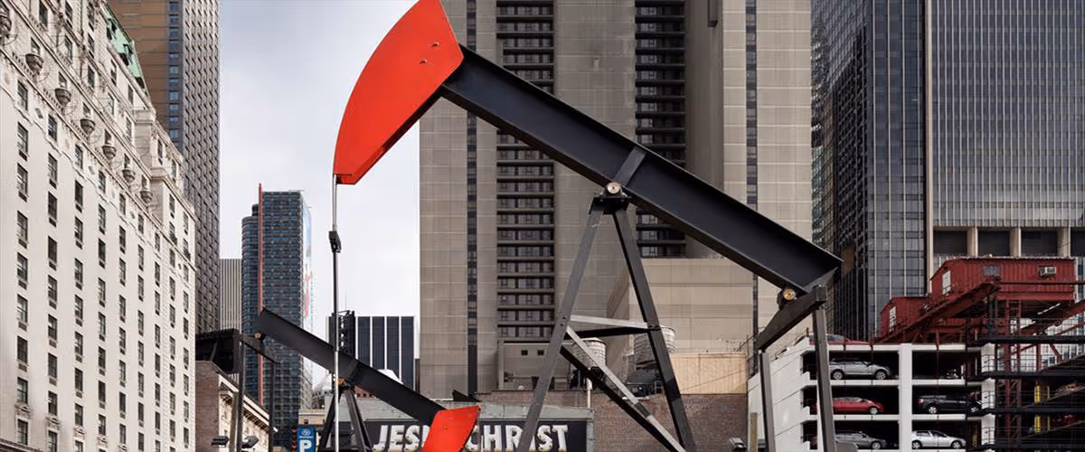 Manhattan Oil Project by Josephine Meckseper was the second installation at The Last Lot project space, presented by Art Production Fund. In Manhattan Oil Project, Meckseper presented two new monumental kinetic sculptures, each standing 25 feet tall. These full scale sculptures were inspired by mid-20th century oil pumps the artist discovered in Electra, a boarded-up town once famous for being the pump jack capital of Texas. The pump jacks recall the ruins of ghost towns, forgotten monuments of America's decaying industrial past. This pairing of the pump jacks and the Times Square location merged a classic symbol of American oil production and wealth with the center of New York City commercial culture.