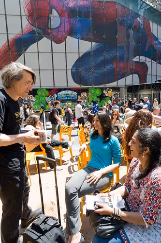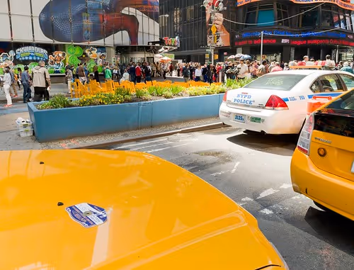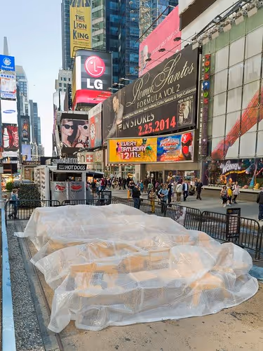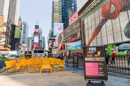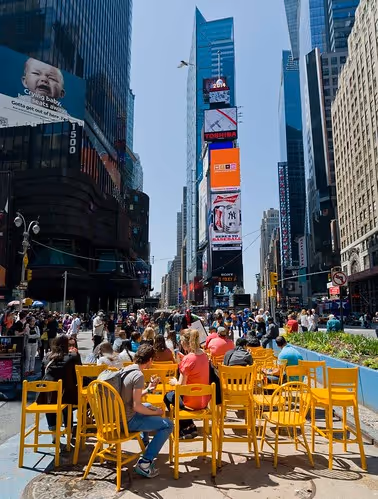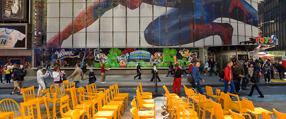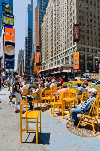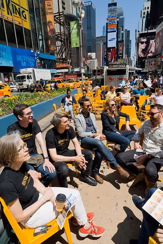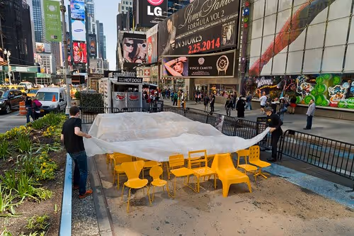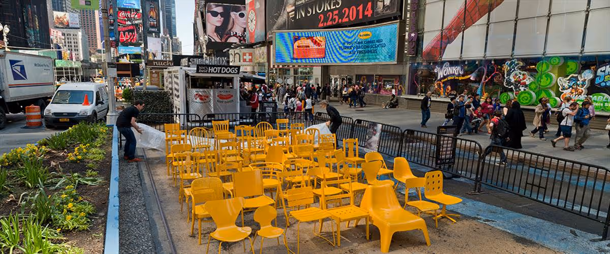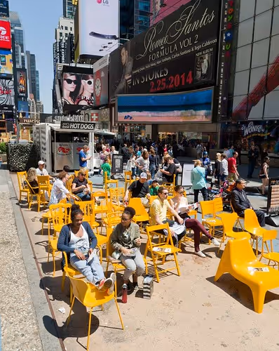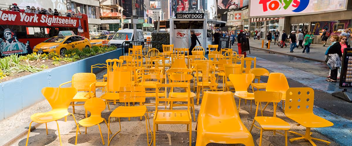 The yellow chairs, arranged in 7 rows of 7, were positioned on a plaza in Times Square where visitors were invited to sit and view the spectacle of Times Square. The precise spacing of the chairs as they were arranged each morning mimicked theater seating with Times Square as the stage. The rearrangement of the chairs throughout the course of the day became a performance about how people use public space and shape it to suit their needs. With their taxicab yellow paint, the chairs re-manifested taxis back onto this Broadway plaza.