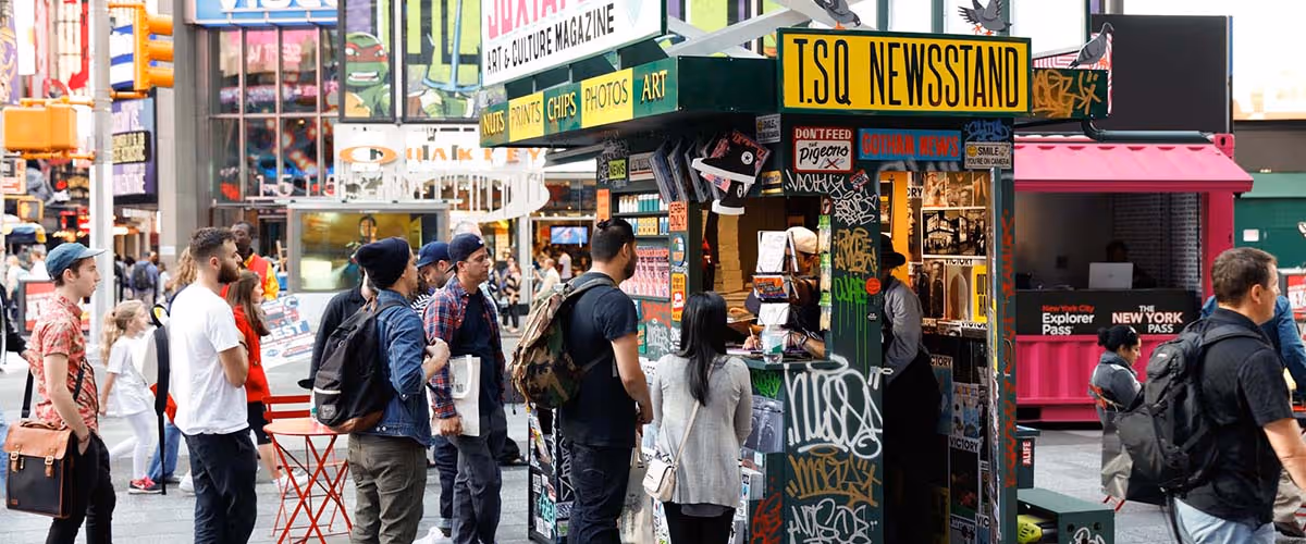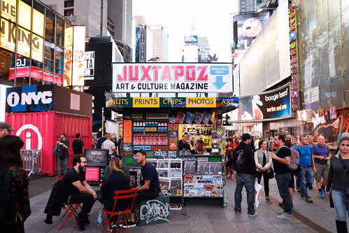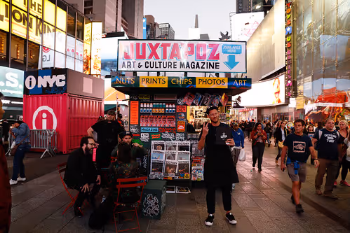 Brooklyn-based and Swiss born artist Kimou “Grotesk” Meyer, Victory Journal, Juxtapoz Magazine, and Times Square Arts installed the T.SQ Newsstand, a new take on the iconic NYC newsstand of yesterday, to the Broadway plaza between 44th and 45th Street from October 9 - October 18, 2015.