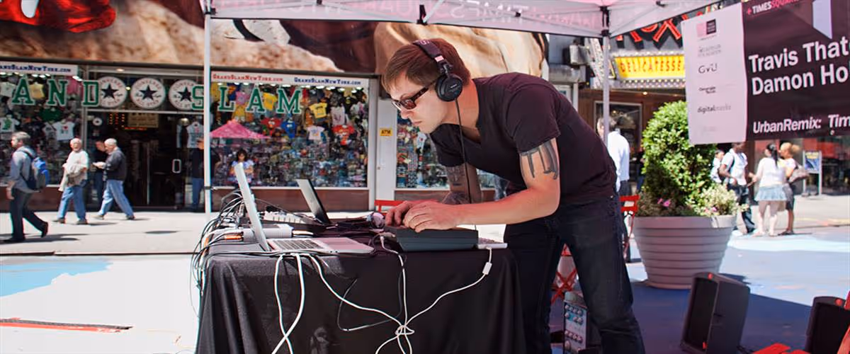 We invited the publice to capture and contribute sounds from Times Square using UrbanRemix's free mobile phone software for iPhone/iOS and Android devices. These sounds were tagged with geo-location, timestamp, and keywords and stored in our server’s database. Using our web-based software application, anyone anywhere was able to explore the contributed sounds, view them on a virtual map of Times Square, and mix and share their own soundscapes. At the conclusion of the project, UrbanRemix performed a remix of the collected sounds in a public space in Times Square, and made the remix available for download and distribution. In addition, we developed and supported an online remix contest and ring-tone generator as alternative performance and distribution formats.