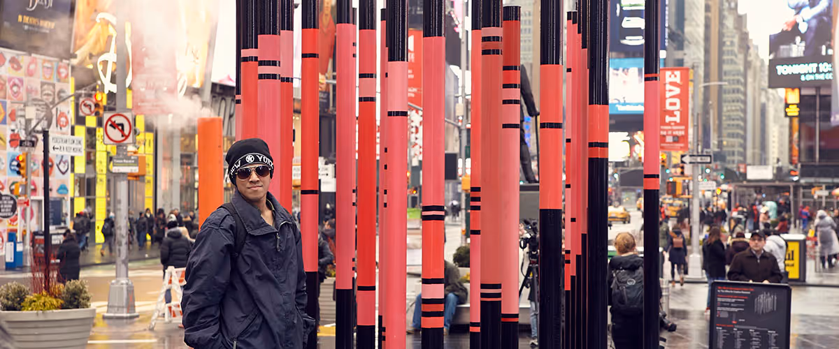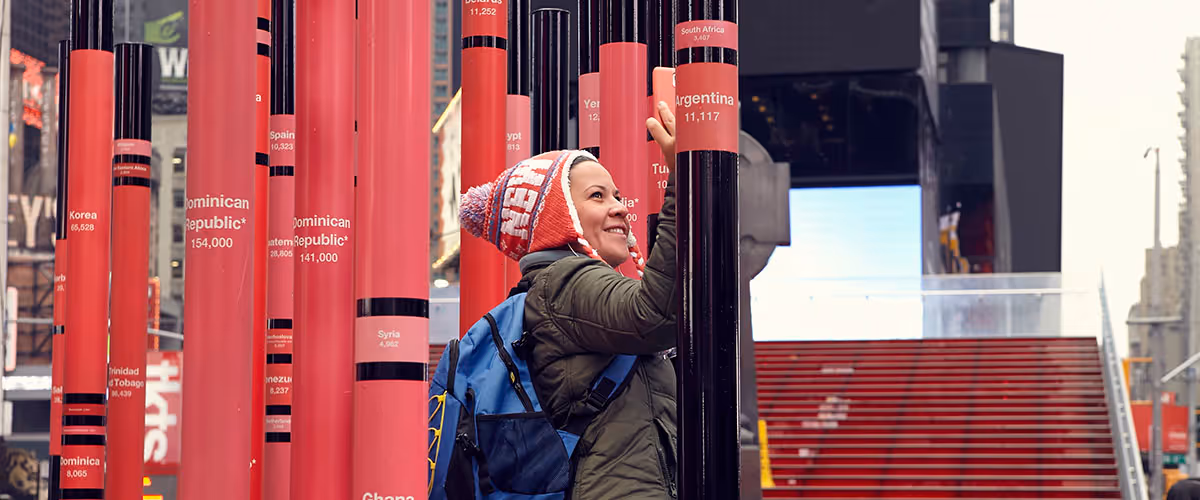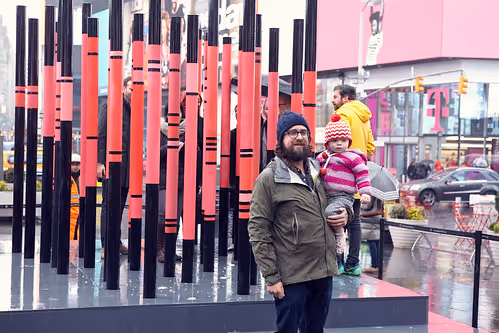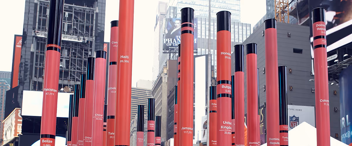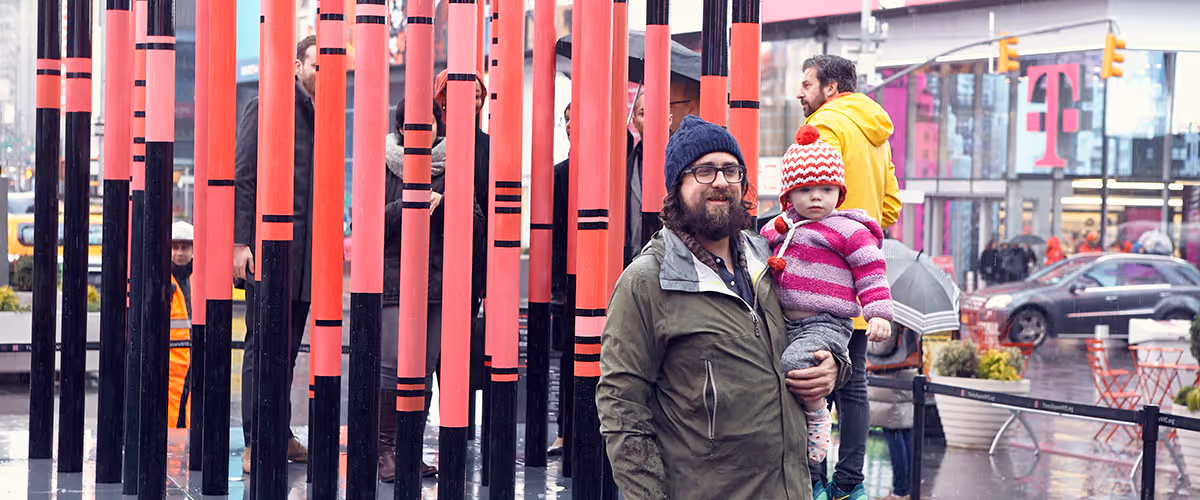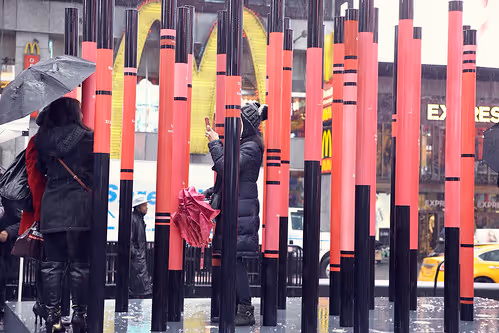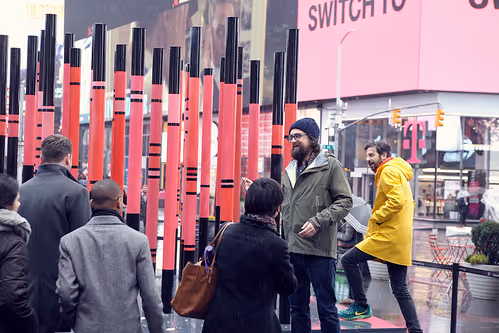 We Were Strangers Once Too is a public data sculpture highlighting the role that immigrants have played in the founding, development, and continued vibrancy of New York City. Data from the 2015 American Community Survey takes visual, sculptural form in 33 metal poles, inscribed and hued to represent the national origins and shifting populations of foreign-born NYC residents. As visitors travel around the sculpture to a designated observation point, their perspective shifts until the individual color blocks of red and pink resolve into an iconic heart.