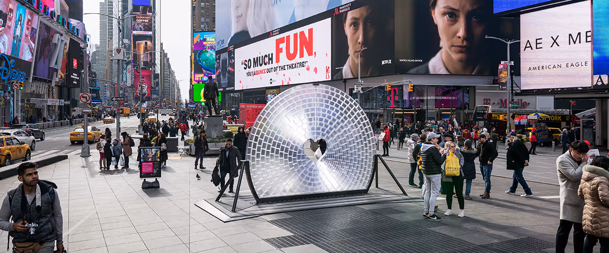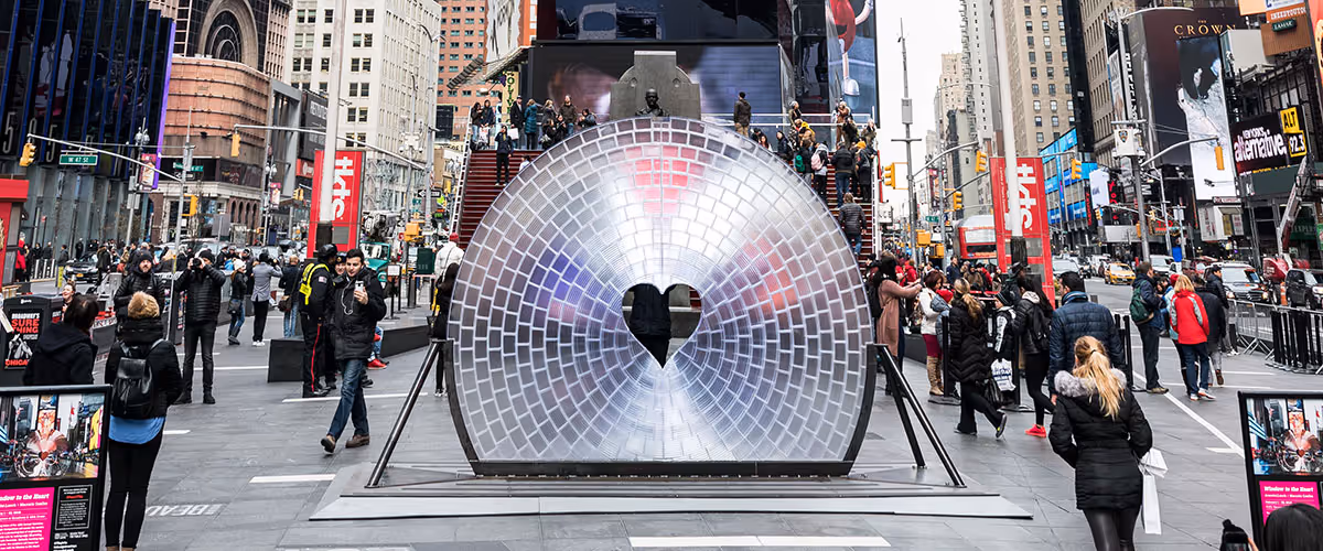 In one of the world’s most Instagrammed places, filled with cameras of all shapes and sizes, Window to the Heart places the world’s largest lens in the center of Times Square. The 12 foot in diameter Fresnel lens was designed with 3D-printing manufacturer Formlabs to distort and capture the image of Times Square, optically bending light – and attention – to the heart-shaped window at its center. Visitors can look through the window or photograph themselves within it, completing the loop between the lens of the eye and the lens of the camera.